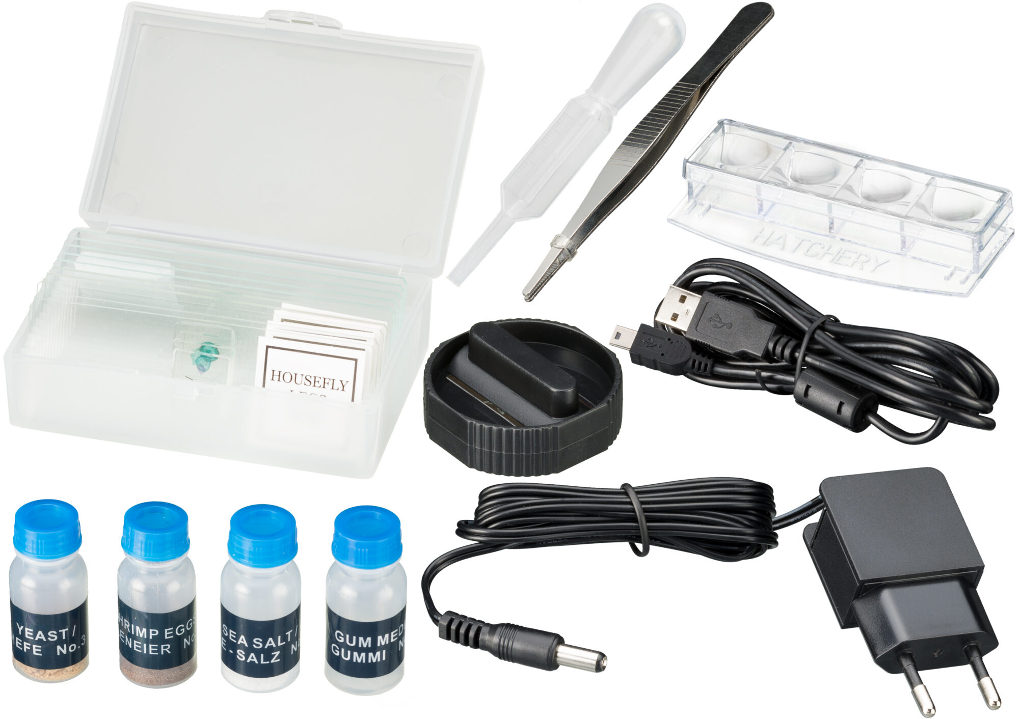 - Large accessory pack with yeast, gum media, see salt, shrimp eggs, scissor, tweezers, pipette, 2 preparing needles, microtome, hatchery tank