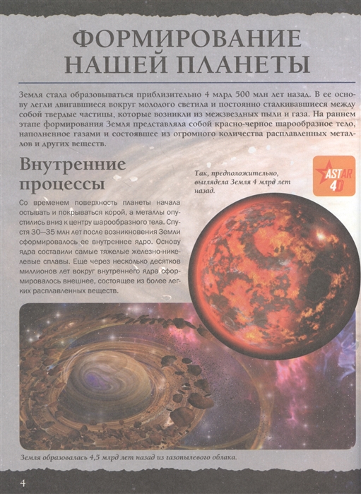 Эта книга рассказывает о нашей планете, которая за 4,5 миллиарда лет из раскаленного облака превратилась в обитель человеческой цивилизации. За всеми явлениями, происходящими на Земле, теперь можно наблюдать прямо на этих страницах, ведь это не обычная книга, а 4D-издание! Читай, изучай иллюстрации, рассматривай объемные движущиеся модели, слушай познавательные аудиозаписи. Элементы дополненной реальности обязательно помогут новым знаниям запомниться надолго.